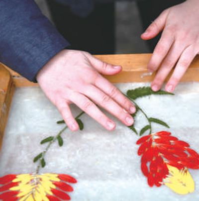 石桥古法造纸制品有白皮纸和彩色纸两种类型,其中彩色纸可分六大系列,在小院最受追捧的当数花草琥珀纸。先将纸浆铺入一个方形木框内,然后取新鲜花草随意搭配,在纸浆上组合成自己喜欢的图案,再在上面覆盖一层纸浆,一幅精美的花草画卷便跃然而出。最后把作品框搬到后院进行晾晒,3个小时后,花草琥珀纸就大功告成了。斗转星移,花草的自然形态和本真色彩将与纸张融为一体,原本短暂的绚烂得以长久保存。