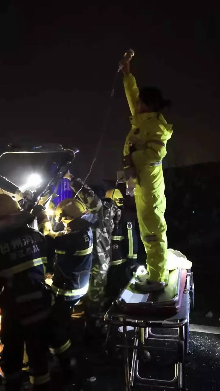 信中还夹了一张照片,照片里显示的是一个深夜的高速车祸现场。台州市第一人民医院急诊科一位120护士淋着雨,站在一辆急救车上,保持着高举输液瓶的姿势。