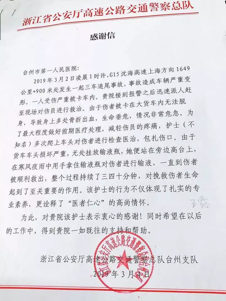 台州高速公路方面因此给医院写来感谢信,让医院找到并表扬一下这位女护士。
