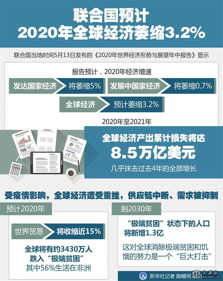 大西北网讯  联合国13日发布的《2020年世界经济形势与展望年中报告》显示,受新冠疫情影响,2020年全球经济预计萎缩3.2%。