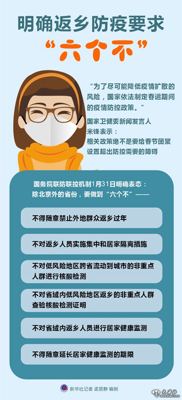 不得随意禁止外地群众返乡过年;不对返乡人员实施集中和居家隔离措施;不对低风险地区跨省流动到城市的非重点人群进行核酸检测;不对省域内低风险地区返乡的非重点人群查验核酸检测证明;不对省域内返乡人员进行居家健康监测;不得随意延长居家健康监测的期限。