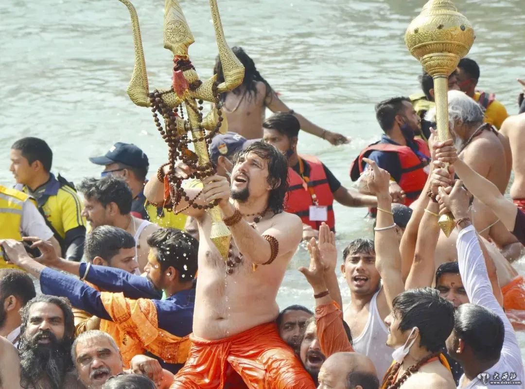 4月14日,在印度北阿肯德邦的赫里德瓦尔,民众在恒河下水沐浴庆祝“大壶节”。(新华社发)