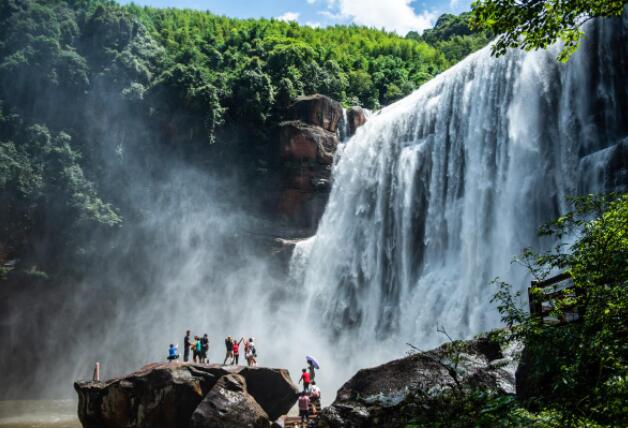 游客在位于贵州省赤水市的赤水大瀑布景区游玩