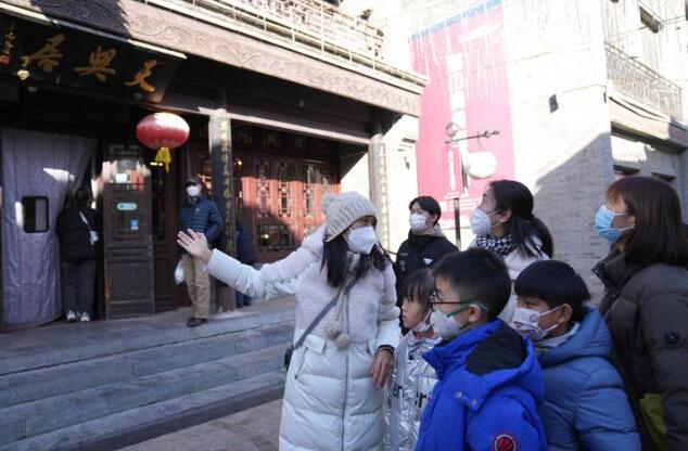 1月28日,在北京市东城区鲜鱼口街,导游何静(左一)在为定制旅游团的游客讲解。新华社记者鞠焕宗摄。