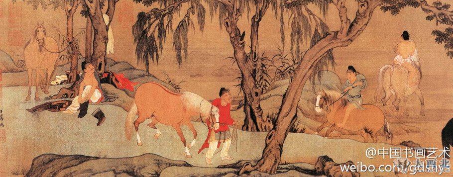 此卷画溪水一湾,清澈透明,梧桐垂柳,绿荫成趣,骏马数匹,马官九人。画中人物、鞍马分别施以不同色彩,丰富浓郁而又清丽,做到了色不掩笔。用笔精细,色调浓润,风格清新秀丽。是代表了赵孟