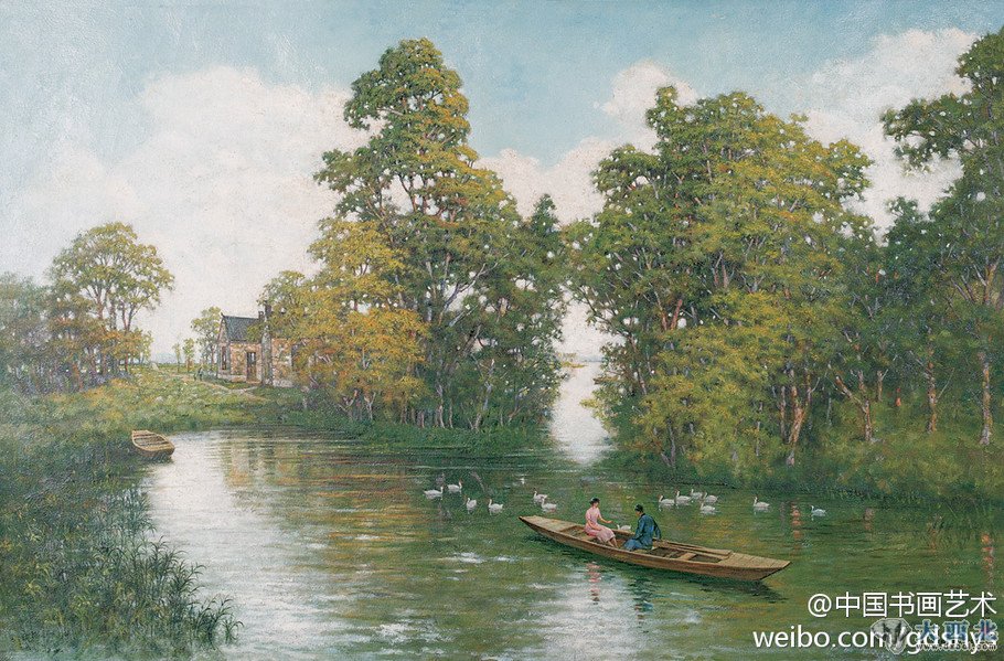 颜文梁作品多见小品,以细腻雅致的风格受到众人所喜爱,此幅有其秀丽精致的风格,细微至湖面鹅群、旷阔至蓝天白云,其色调层次变化精心绘制,从中亦可见艺术家对此画极具用心之处!