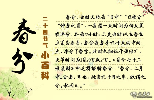 3月20日前后,为春分节气。从惊蛰的“桃始华,仓庚鸣”,到春分的“一候玄鸟至,二候雷乃发声,三候始电”,大自然逐渐结束“默片”时代,变得更加有声有色。冬至和夏至的关键字是极与最,春分和秋分的关键字是平与均。春分体现的是“平均主义”。古人说:“春分者,阴阳相半也,故昼夜均而寒暑平。”目前,很多国家还都“一刀切”地将春分(昼夜平分日)作为春季的开端,有些国家甚至将其定为新年的起始。古时帝王是春祭日、秋祭月,从周代开始便在春分日“祭日于坛”。春分时节,除了拜谢阳光之外,还会专程迎接燕子。古代的“气象预报员”有很多,但燕子是唯一享受皇家正式欢迎仪式的,享受最高规格的礼遇。“是月也,玄鸟至。至之日,以大牢祠高禖(méi),天子亲往。”“人间旧恨惊鸦去,天上新恩喜鹊来。”燕子没有乌鸦和喜鹊那般脸谱化的标签,却人见人爱,至今保持着好人缘、高人气。
