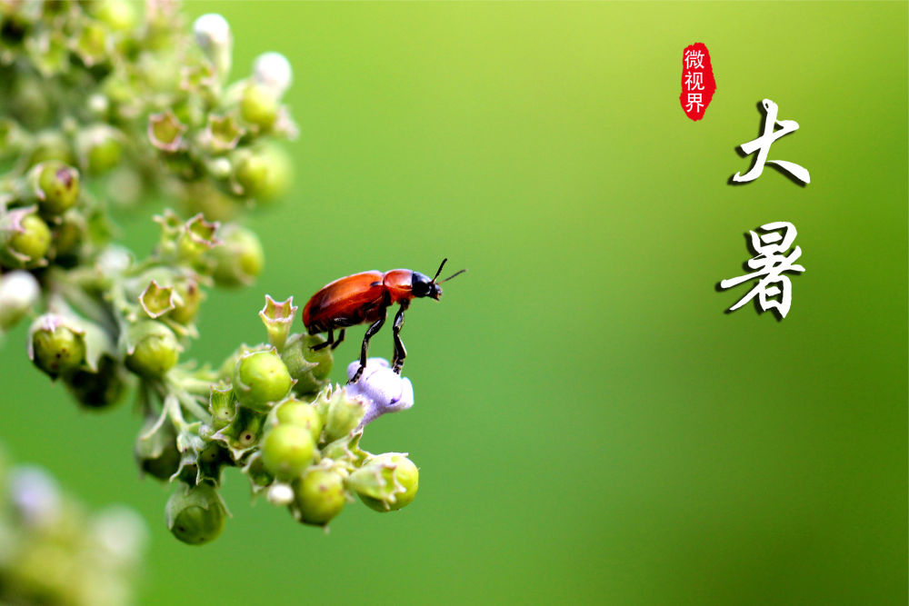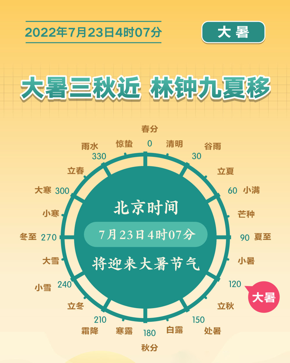 “赤日几时过,清风无处寻”。北京时间7月23日4时07分将迎来大暑节气。它是二十四节气中第十二个节气,也是夏季最后一个节气。大暑一般在“三伏天”里的中伏前后,民间有“冷在三九,热在中伏”的俗谚。当蝉鸣的声音,逐渐变得浑厚。炎风暑雨交替,盛夏的每一天都记载了生命的绚烂。“新竹日以密,竹叶日以繁”,是盛夏赋予的生命力,繁茂如林;“汉宫圆扇初成咏,珠箔初褰深院静”,是用心感受身边的诗意,从容自若;“星明残照数峰晴,夜静惟闻水有声”,是游子披星戴月的征程,风景如画;“竹里全无暑气,溪边长有清风”,是炎暑里的清凉时刻,乐乐陶陶……小暑接大暑,大暑连三秋,大暑一到,也意味着离秋天越来越近了。唐代诗人元稹说“大暑三秋近,林钟九夏移”,这里的“林钟”是古乐十二律之一,随着律音响起,夏天(九夏)就要过去了。四季更迭的脚步,悄然无声,却终将铿锵有力,再一次告知我们光阴故事和道理。