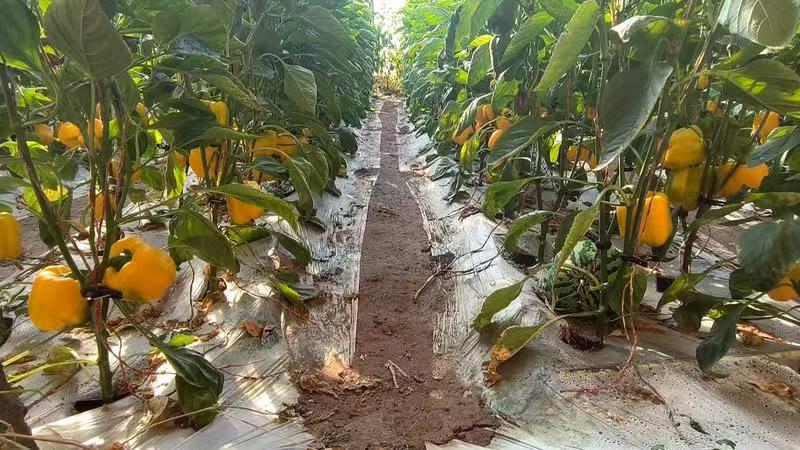 走进大棚,暖意袭来,映入眼帘的是那一排排绿意盎然的菜椒树,红色菜椒鲜艳夺目,个头饱满,表皮光滑而富有光泽,在绿叶衬托下愈发显得娇艳欲滴,黄色菜椒色泽金黄,圆润饱满,红的热烈,黄的灿烂,它们相互交织,充满了生机与活力。
