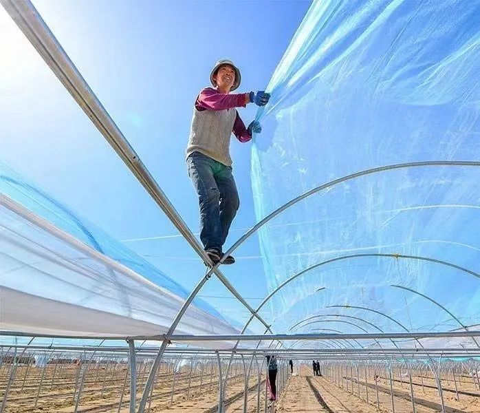 育苗播种正当时,生产不误春耕季。眼下正是蜜瓜育苗、拱棚搭建的时节,在玉门市花海镇万亩蜜瓜产业园,工人们正在搭建棚膜,今年农户们采取‘一棚三膜’的模式,即大棚套小棚,小棚套地膜,进一步提高花海蜜瓜的产量和品质。