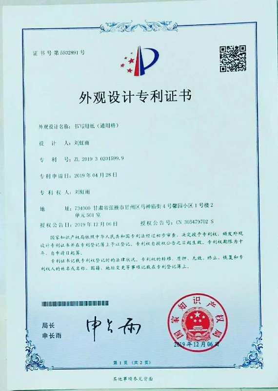 鑫报·大西北网甘州讯(特约记者付聪林)近日,张掖市潇阳书院硬笔书法老师刘虹雨设计的书写用纸(通用格)获国家外观设计专利证书。