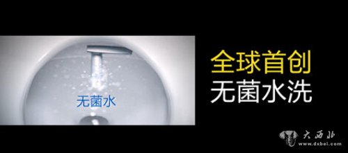 这确实是一款非常突出的产品。当许多人驻足欣赏时,一下子被圆台后方超出马桶高度的长方形立板吸引着了!在这块立板的顶端正前方张贴着一张宣传这款马桶的长条海报,海报的左侧是一个正在喷水的喷头,在海报的上方中间有一行字:“爱无菌水智能马桶全球首创”,越过海报上下的黄金分割线,在那个喷头和其喷出的水之间,有一行字:“可以喝的水”。