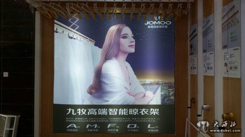 洁白色的标牌镶嵌在咖褐相间的外立面竖格上,与下面咖色边框的玻璃门相互映衬,显得宽敞明亮、端庄大气。标牌与大门的中间是一条闪烁着红色字眼的LED滚动屏。“本店专营:九牧、品牌、卫浴、晾衣架。新店开业全场6.5折……”等字眼自右向左滚动播出。