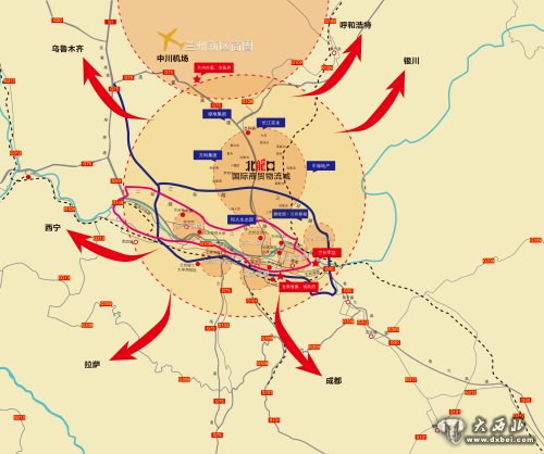 从交通上看,北龙口向南是兰州老城区,距市中心(张掖路)仅10分钟车程,向北是兰州老城区通向兰州新区、中川机场、白银等区域的唯一交通要道。同时,通向航空港(兰州中川机场)、铁路港(兰州铁路货运中心)、公路港(项目周边各条高速核心枢纽地区)等各物流港车程不超过25分钟。