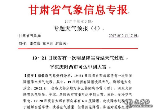 大西北网讯 记者王占东 通讯员车玉川 文/图 今日上午,记者从兰州中心气象台获悉,据该台最新天气预报显示,20—21日,甘肃省将迎来2017年以来最强冷空气的侵袭,受此影响,全省大部地区将出现一次较强雨雪降温天气过程,陇东局地将有暴雪,河西中部地区将有寒潮。