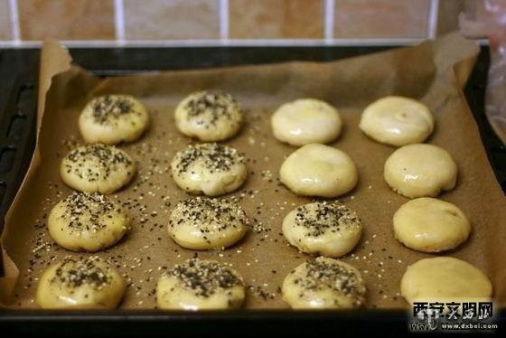 将板油撕去皮膜,切成小丁,刀背砸成油茸。加入用桂皮、花椒熬成的调料水和适量精盐搅拌均匀。取面粉加水和成面团,揪成面剂,用手按平后擀成长形面 片,抹上一层油茸,卷成圆柱形,搓成长条,反复行叠后再揪成小剂,制成饼坯。在饼坯上刷一层鸡蛋液或蜂蜜水,放入铁炉中烘烙,待外皮呈金黄即成。