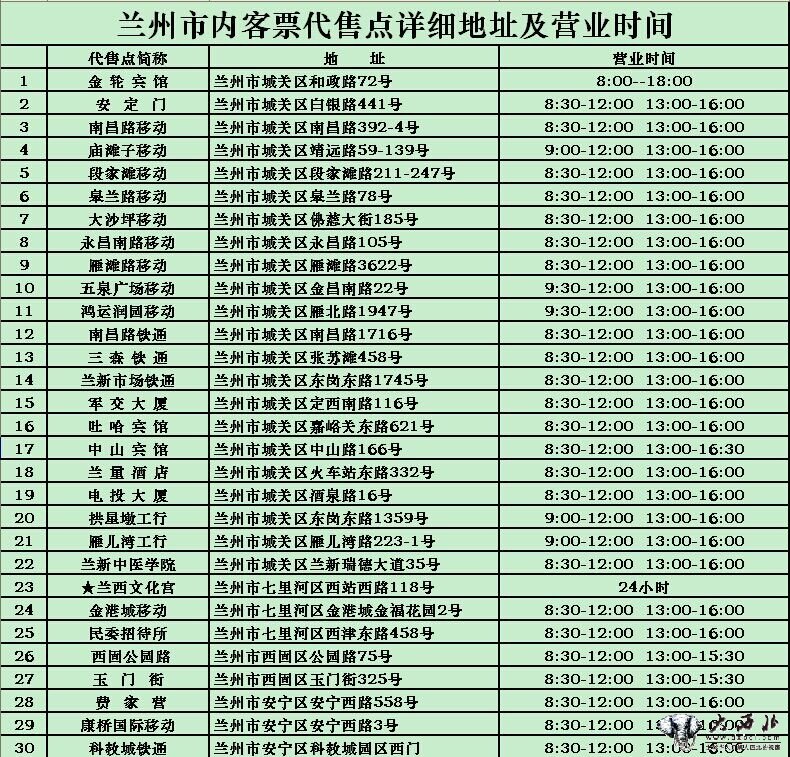 大西北网讯 #温馨提示#各位旅客你们好:由于“十一”期间客流量较大,车站互联网取票机前或有排长队现象,在此提醒广大旅客,凡在互联网订票成功后,请您及时到就近的火车站或代售点取票(后附30个市内火车票代售点地址),以免耽误您的行程。