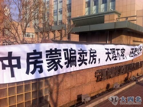 业主们打横幅在宁夏中房公司门口抗议。(图片来源于网络)