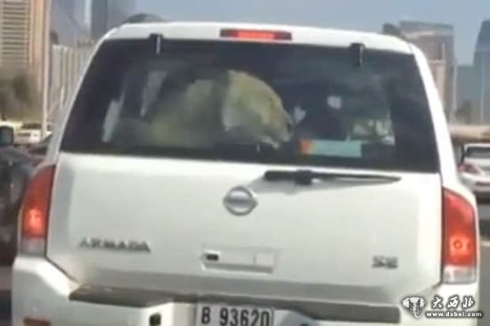 迪拜一位司机开车载狮子出门,狮子在后座蠢蠢欲动,双眼注视着车窗外的风景。