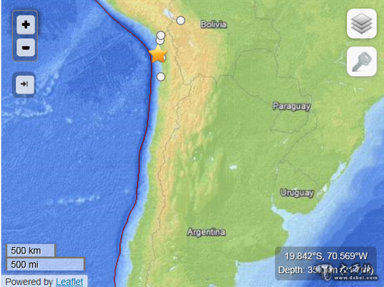 美国地址勘探局称,地震震中位于伊基克西北64公里处。太平洋海啸预警中心称,此次地震预计不会引发海啸。