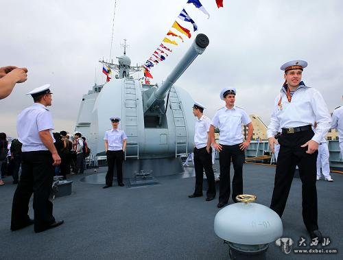 5月19日,俄罗斯海军“瓦良格”号导弹巡洋舰官兵在中国海军导弹驱逐舰郑州舰上参观。