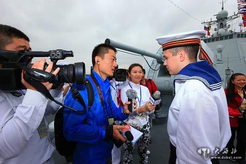 5月19日,俄罗斯海军“瓦良格”号导弹巡洋舰官兵在中国海军导弹驱逐舰郑州舰上参观时,接受中国媒体记者采访。