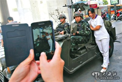 在曼谷豪华购物中心聚集的一处路段,军人持枪警戒引发围观。美联社说,氛围并不紧张,一些路人对着士兵拍照或自拍,一些人摆出姿势与士兵合影,士兵亲切配合。