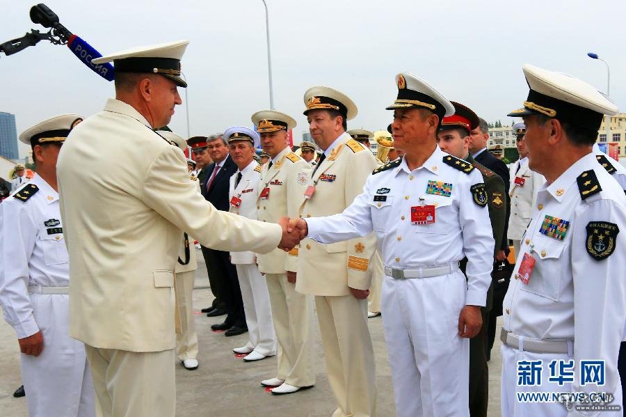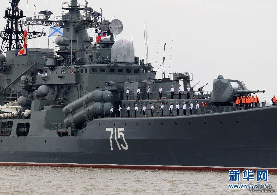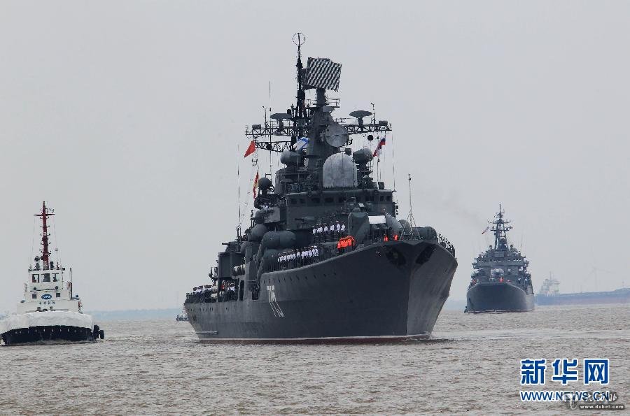 5月18日,参加中俄“海上联合—2014”军事演习的俄方舰艇陆续驶抵上海某军港。中俄两国海军互鸣礼炮,中方为来访的俄舰举行隆重欢迎仪式。俄罗斯太平洋舰队旗舰“瓦良格”号导弹巡洋舰驶入军港时,参加欢迎仪式的军乐队奏响欢迎曲。随后,“快速”号驱逐舰、“潘捷列耶夫海军上将”号大型反潜舰、“伊利姆”号中型海洋油船、“涅维尔斯科伊海军上将”号大型登陆舰,“卡拉尔”号海洋拖船陆续驶入港口。这次联合军事演习,中俄海军都派出了主战舰艇参加。中方参演兵力包括导弹驱逐舰、导弹护卫舰、综合补给舰以及导弹艇等水面舰艇8艘、潜艇2艘、固定翼飞机9架。俄方参演兵力包括巡洋舰、反潜舰、驱逐舰、登陆舰、油船和海洋拖船等水面舰艇6艘。此外,为执行海上联合解救被劫持船只、护航等特殊任务,双方还派出舰载直升机、特战分队等兵力参加此次演习。(新华社记者 查春明摄)