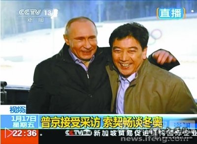 资料图:索契冬奥会时普京受访,拥抱水均益