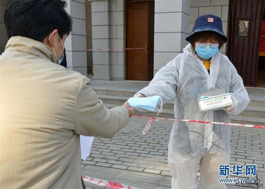 2月9日,武汉市武昌区昙华林社区工作人员为社区居民发放防护物资。 新华社记者 李贺 摄