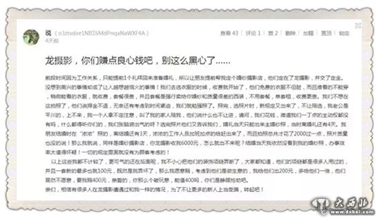 大西北网讯 11月26日,寇女士在掌上白银微社区发贴“龙摄影,你们赚点良心钱吧,别这么黑心了......”,帖子内容反映了她在龙摄影拍婚纱照的闹心拍照过程,以下为贴子内容截图,该贴子已于11月30日由寇女士本人删除。
