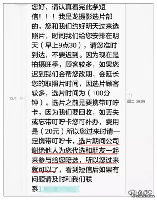 (图为龙摄影店工作人员发给寇女士的短信截图)