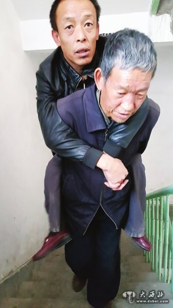 田荣春老人背着儿子上楼