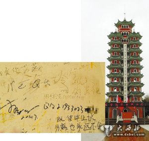 如今,依塔内楼梯逐层而上,先后会看到长征渡口、遵义会议和瓦窑堡会议旧址,以及红军大渡桥横、金沙水拍、爬雪山、过草地等数十幅照片张贴在墙上。令人遗憾的是,这些墙壁却也无一幸免地被乱涂乱画。在第四层,有交友,假币广告;第五、六层墙壁则被密密麻麻的黑脚印所踩踏污染;而诸如爱情宣言、一箭穿心、到此一游等字迹图画则贯穿整个塔内1至11层的墙壁、窗棱、楼梯口。