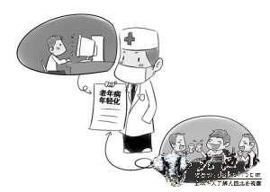 面对如此之多的病例,年轻人还淡定吗?怎样才能避免“老年病”的矛头不瞄准自己?专家指出,年轻人工作压力大、生活节奏快的确是导致一些疾病提前发作的重要原因,但这是现代社会发展的必然趋势,这种工作压力只会加剧不会减轻,所以我们应当在此基础上关注那些能够解决的致病因素。不良的生活习惯是诱发各种疾病的罪魁祸首,人们应该注意改变生活方式,使生活规律化,保证足够的睡眠;在饮食方面,有些人只顾满足口腹之欲,盲目进补,摄入了过多的油腻食物,脂肪和胆固醇在体内过多堆积。现在的年轻人缺乏自我保健意识,他们饮食不规律,过量食用高脂肪食物,再加上酗酒、吸烟、熬夜,这在很大程度上危害了他们的身体健康。专家建议,不要贪食太咸、太甜、太油腻的食物,多吃一些蔬菜、瓜果类的清淡食品以补充足够的维生素。同时,工作之余要培养多种兴趣,保持精力旺盛,使生活更加充实。此外,还应该多接触大自然,多进行体育锻炼,善待压力,以拥有健康、良好的心境。