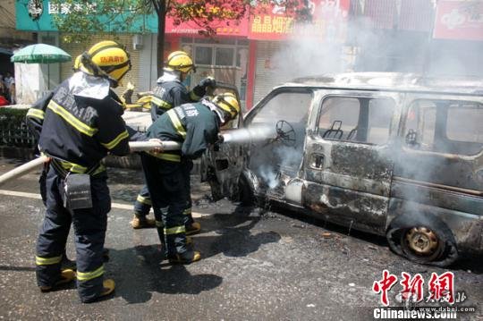 消防救援人员在11时30分许达到现场,经侦察发现起火面包车正处于猛烈燃烧阶段,着火车辆头顶4米处是高压电线,一些电线因受火焰浓烟熏烤已经掉皮,周围5米处是商铺,燃烧车辆随时有可能发生爆炸。