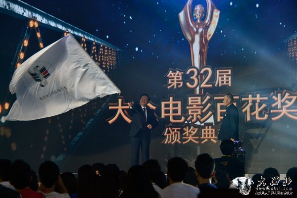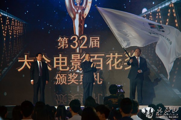 兰州市副市长曹丕玉移交中国金鸡百花电影节会旗给李雪健。 贾笑云 摄