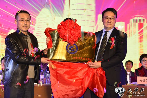 全国工商联副秘书长王钢治为甘肃省投资商会会长李成勇授牌。 贾笑云 摄