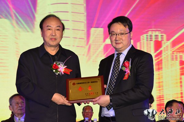 甘肃省政协原副主席杜大仕为甘肃省投资商会执行会长靳占荣授牌。 贾笑云 摄