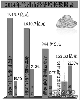 2014年,兰州市实现生产总值1913.5亿元,增长10.4%。全社会固定资产投资1610.7亿元,增长22.3%。社会消费品零售总额944.9亿元,增长12.7%。公共财政预算收入152.33亿元,增长22.36%。进出口总额占全省的52.7%。非公有制经济增加值占全市生产总值的一半。城镇居民人均可支配收入23030元,农民人均纯收入8067元,分别增长为10.9%和13.4%。