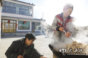 走到包普安家大门口,尚未安装大门的院子边上,包普安的媳妇包兔巧正在翻炒一大锅肉片,包普安则正在向炉子里添加木柴。“过年杀了两头年猪,下来差不多有300斤肉,除了做成腊肉骨头外,剩下的都切成肉片和肉臊子了,过年的时候炒个菜、拌面的就都有了!”包普安边笑着、说着,边将记者引进了刚住了3个来月的新房中。