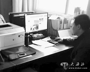 3月11日上午11时50分许,记者来到定西市安定区政府大楼继续暗访。记者在一楼南侧安定区民政局一间门上贴着“城乡低保办、社会事物股、民政股”字样办公室里,看到一位女工作人员埋头整理材料,工作很认真,而旁边一个青年男子却在上网,电脑屏幕的页面上有“晚上吃三种水果减大肚子”等字样。当记者问道:“你上班期间怎么在上网看这些?”这名青年男子立即关掉刚才看的页面,然后支吾着说:“我错了,我错了,以后一定改!”