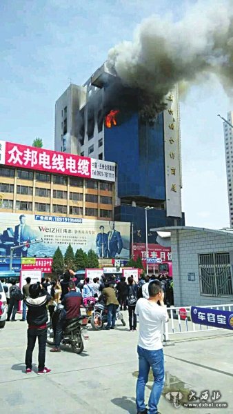大西北网4月20日讯 4月19日中午1时许,位于兰州火车站北侧马路对面的甘肃供销合作商厦发生火灾。据了解,该楼为拆迁楼,并没有人员被困。由于火势较大,兰州消防调集5个消防中队前往扑救。约2小时后,大火被扑灭。