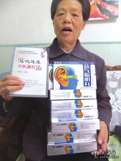 4月20日,刘大妈指着没有服完的8盒药品给记者看。该药名为杨松林益气聪丸,主治耳鸣耳聋,视物昏花,生产企业为西安天一秦昆制药有限公司。刘大妈手中还有一本“耳鸣耳聋中医新疗法”的书籍。“先是免费送书,后是要求买药,纯属骗人把戏。”刘大妈说。