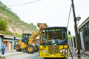 5月16日上午9时许,记者赶到现场看到,一辆车号为甘A·29950的123路公交车车头朝东,停放在马路靠北边,一辆装载机停放在马路南侧的台阶上。装载机完好无损,公交车车头毁损较重,挡风玻璃完全破碎,地上到处是破碎的玻璃和车辆零部件。由于该路段较窄,车祸导致该路段出现交通拥堵。
