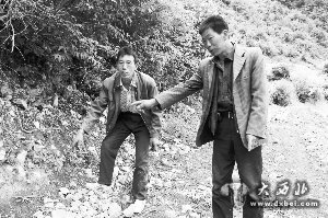 村民乔家武(右)和王秦家武(左),在现场指认大熊猫下山途经地。本报通讯员刘江林摄