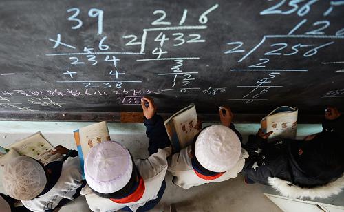 3月25日,东乡县龙泉乡北庄湾村小学的学生在黑板上练习功课。
