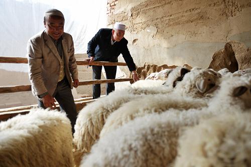 3月16日,东乡县龙泉乡北庄岭村支部书记赵国俊(右)和村民赵麦得在羊圈里查看羊的生长情况。