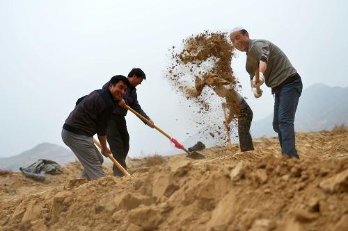 4月1日,东乡县扶贫干部在布楞沟村为当地群众种树。