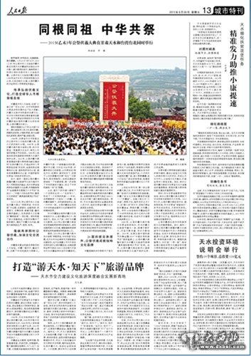鼓声雄浑,钟鸣悠远,龙旗猎猎,雅乐飘飘。6月22日9时50分,2015(乙未)年公祭中华人文始祖伏羲大典在甘肃天水伏羲庙和台湾台北市中影八德大楼同时举行,海峡两岸人民同日同时共祭中华人文始祖伏羲。公祭中华人文始祖伏羲大典自1988年由天水市人民政府恢复主办以来,已成功举办26届,公祭伏羲已成为全球华人寻根祭祖的盛会。